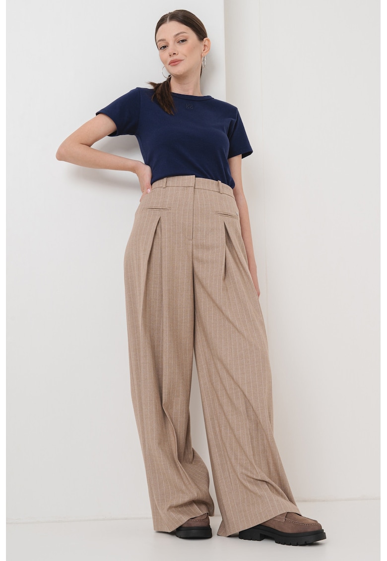 - viscoza Imprimeu: dungi Croiala: evazat Lungime: lungi Talie: inalta Detalii: pliuri Compozitie Exterior: 64% poliester