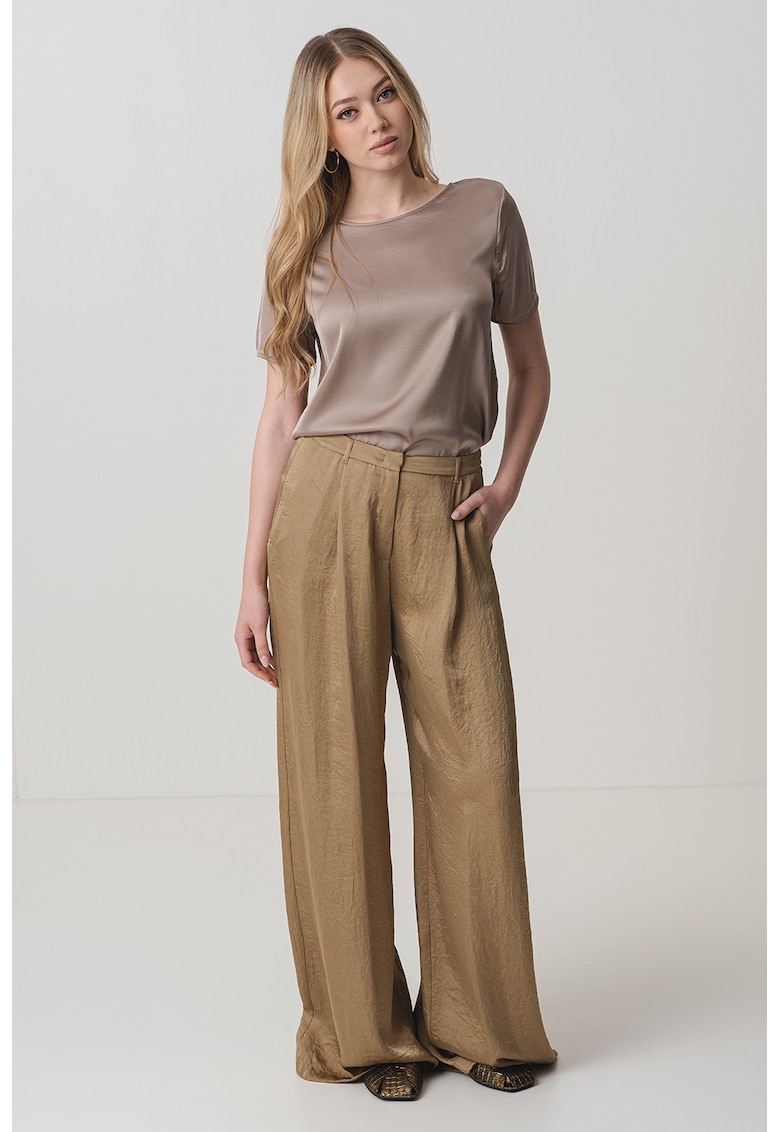 Caracteristici Culoare: maro deschis Stil: casual Material: acetat Imprimeu: uni Croiala: evazat Lungime: lungi Talie: inalta Detalii: buzunare laterale Sistem inchidere: fermoar