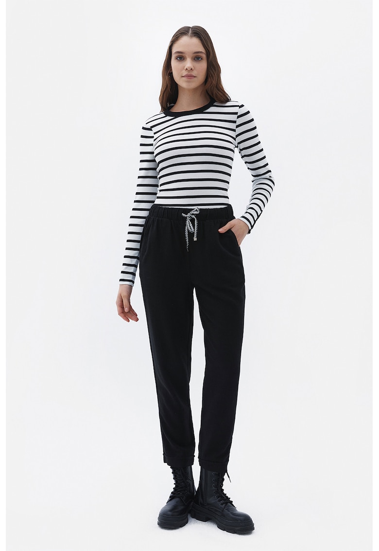 - bumbac Imprimeu: uni Croiala: conica Lungime: crop Talie: inalta Detalii: snur pentru ajustare si insertie elastica in talie Buzunare: unul aplicat pe partea din spate