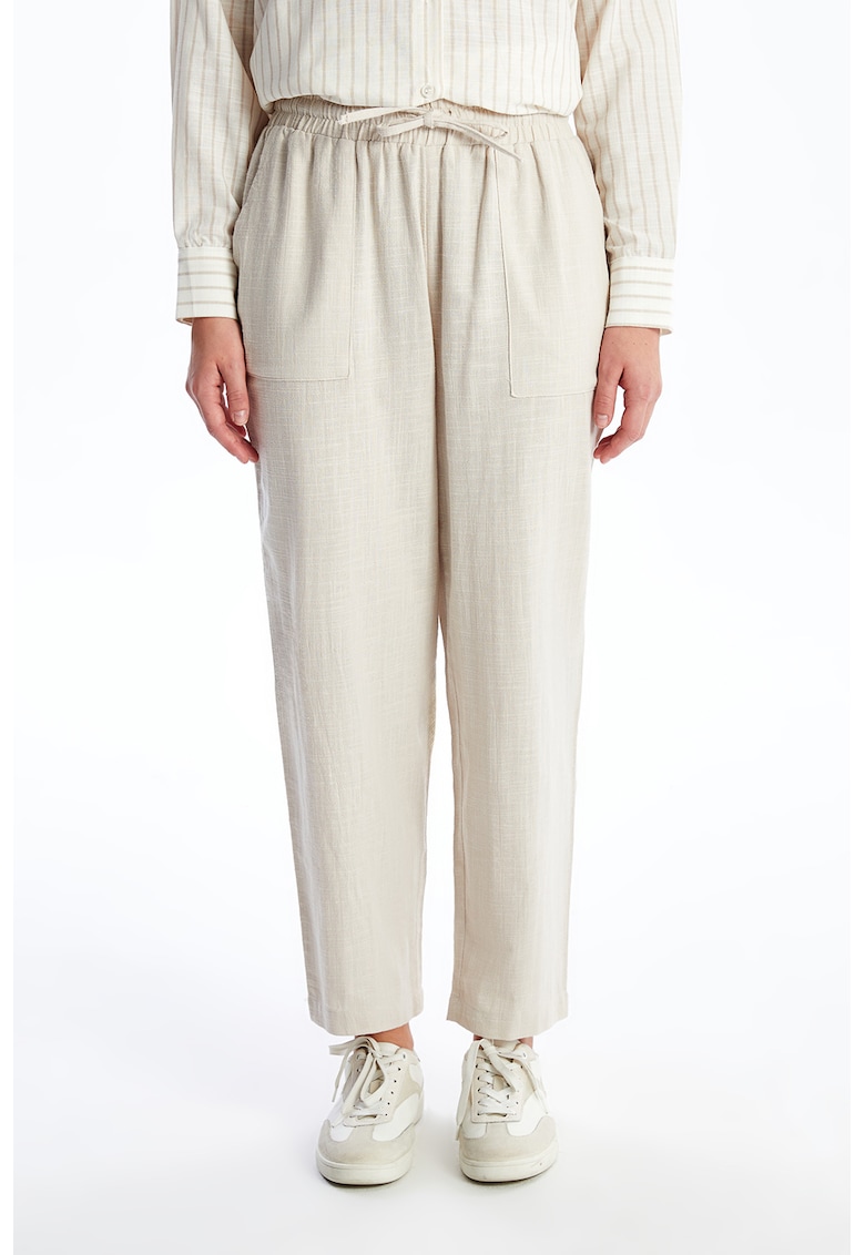 Caracteristici Culoare: bej deschis Stil: casual Material: bumbac Imprimeu: uni Croiala: relaxed fit Lungime: crop Talie: medie Detalii: snur pentru ajustare si insertie elastica in talie Buzunare: frontale Sistem inchidere: fara inchidere Compozitie Exterior: 100% bumbac