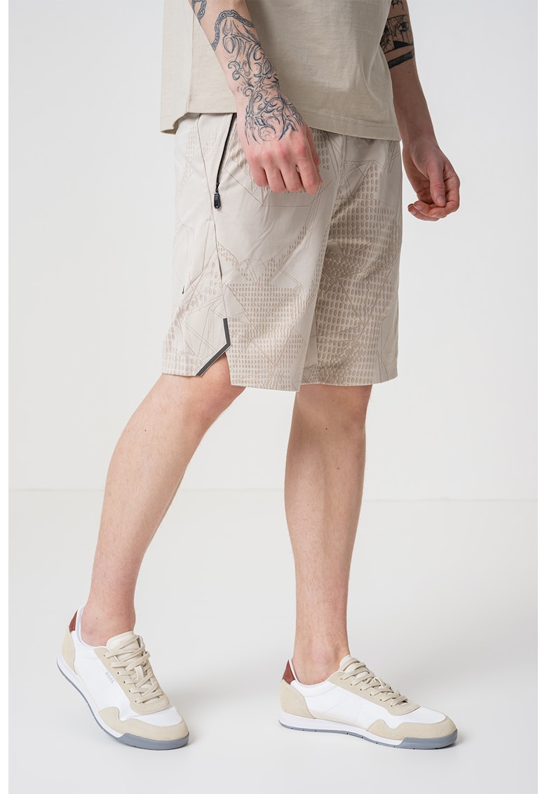 Caracteristici Culoare: maro nisip Imprimeu: grafic Material: poliester Stil: casual Croiala: regular fit Talie: medie Buzunare: 2 buzunare cu fermoar Lungime: scurti Sistem inchidere: fara inchidere Compozitie Exterior: 92% poliester