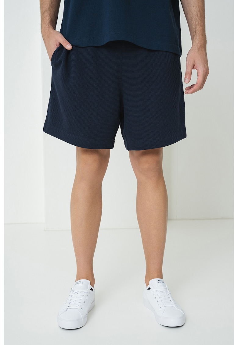 Caracteristici Culoare: bleumarin Imprimeu: uni Material: bumbac Stil: casual Croiala: lejer Talie: medie Buzunare: 2 laterale Lungime: scurti Detalii: snur pentru ajustare in talie Compozitie Exterior: 100% bumbac Info model Modelul poarta un produs de marimea M. Marimi model: 190 cm inaltime