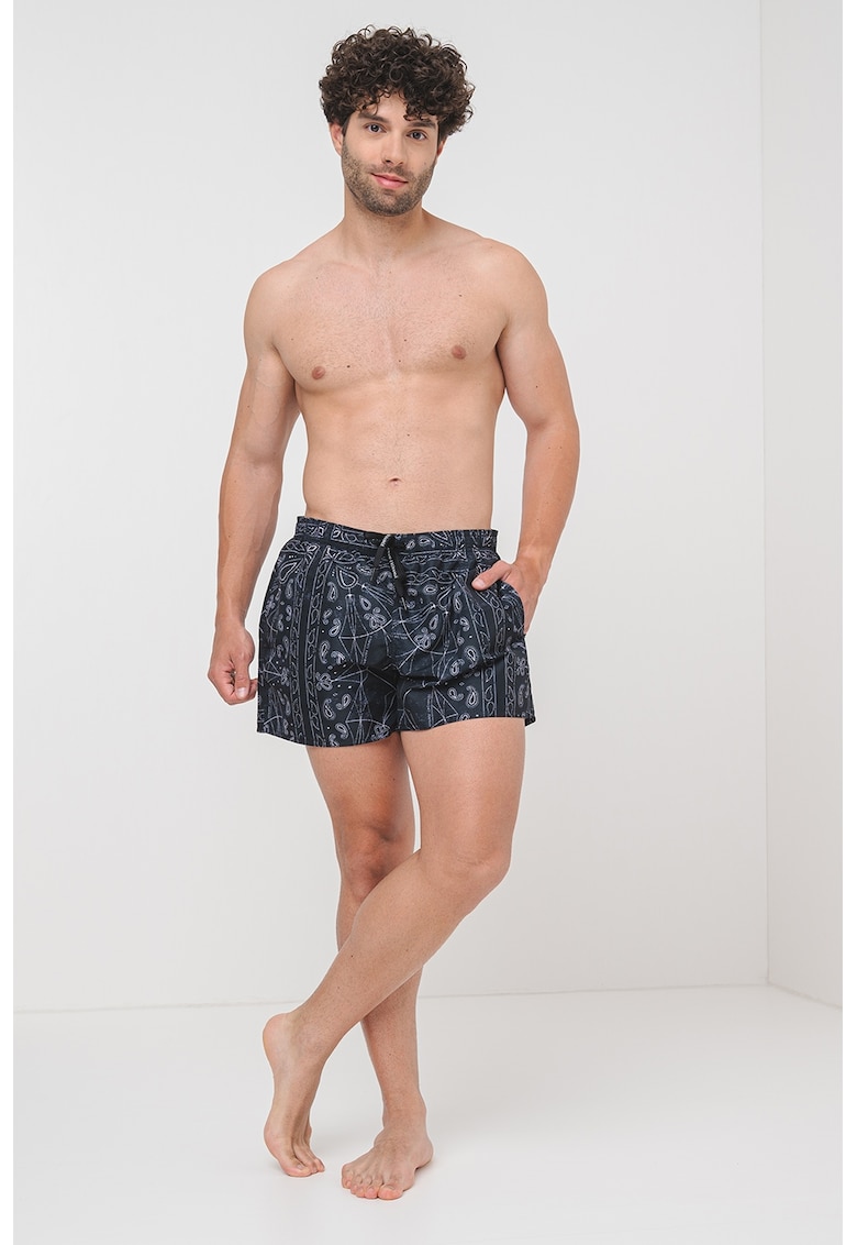 Caracteristici Tip produs: pantaloni scurti Culoare: alb Material: poliester Imprimeu: grafic Talie: snur pentru ajustare Compozitie Exterior: 100% poliester Info model Modelul poarta un produs de marimea M. Marimi model: 179 cm inaltime