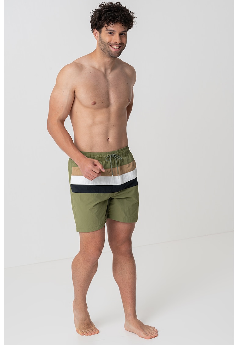 Caracteristici Tip produs: pantaloni scurti Culoare: verde Material: poliamida Imprimeu: dungi Buzunare: pe ambele parti Talie: talie ajustabila cu snur Compozitie Exterior: 100% poliamida reciclata Info model Modelul poarta un produs de marimea M. Marimi model: 179 cm inaltime