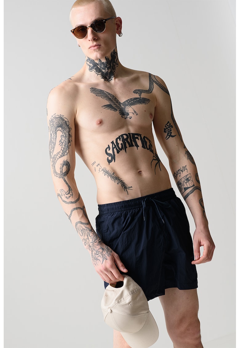 Caracteristici Tip produs: pantaloni scurti Culoare: bleumarin Material: sintetic Imprimeu: uni Buzunare: 2 laterale Talie: medie Detalii: snur pentru ajustare Compozitie Exterior: 100% poliamida reciclata Info model Modelul poarta un produs de marimea M. Marimi model: 188 cm inaltime