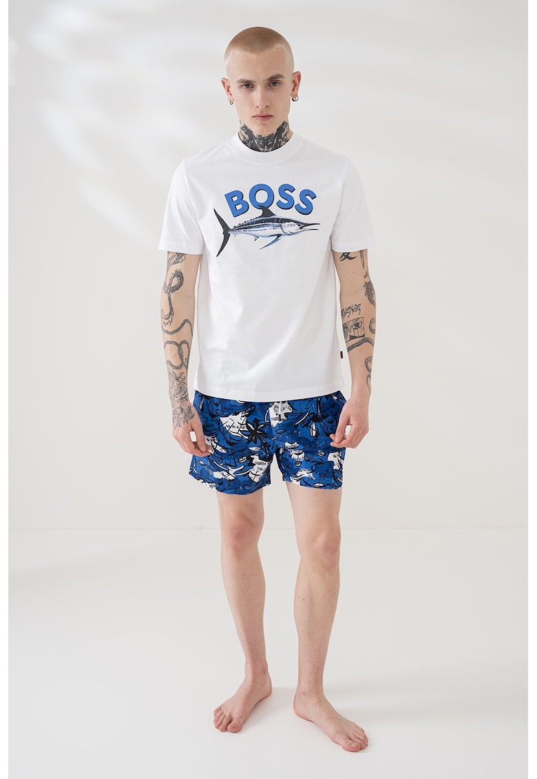 - albastru Material: poliester Imprimeu: grafic Talie: talie ajustabila cu snur Compozitie Exterior: 100% poliester reciclat Info model Modelul poarta un produs de marimea M. Marimi model: 188 cm inaltime