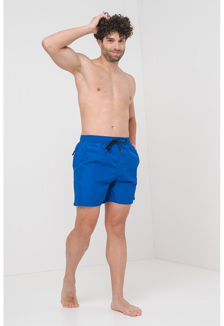 Caracteristici Tip produs: pantaloni scurti Culoare: albastru royal Material: poliester Imprimeu: uni Buzunare: 1 cu fermoar pe partea din spate Talie: joasa Compozitie Exterior: 100% poliester Info model Modelul poarta un produs de marimea M. Marimi model: 179 cm inaltime