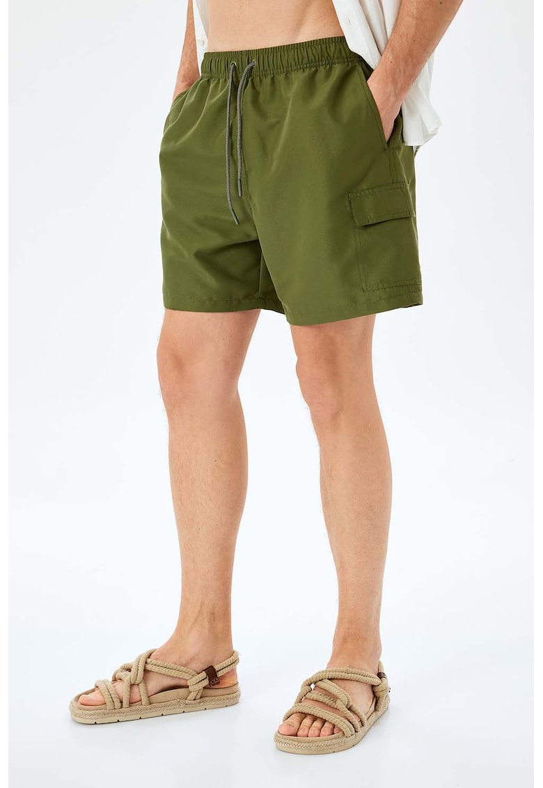 Caracteristici Tip produs: pantaloni scurti Culoare: verde masliniu Material: sintetic Imprimeu: uni Buzunare: in cusaturile laterale Talie: medie Detalii: snur pentru ajustare si insertie elastica in talie