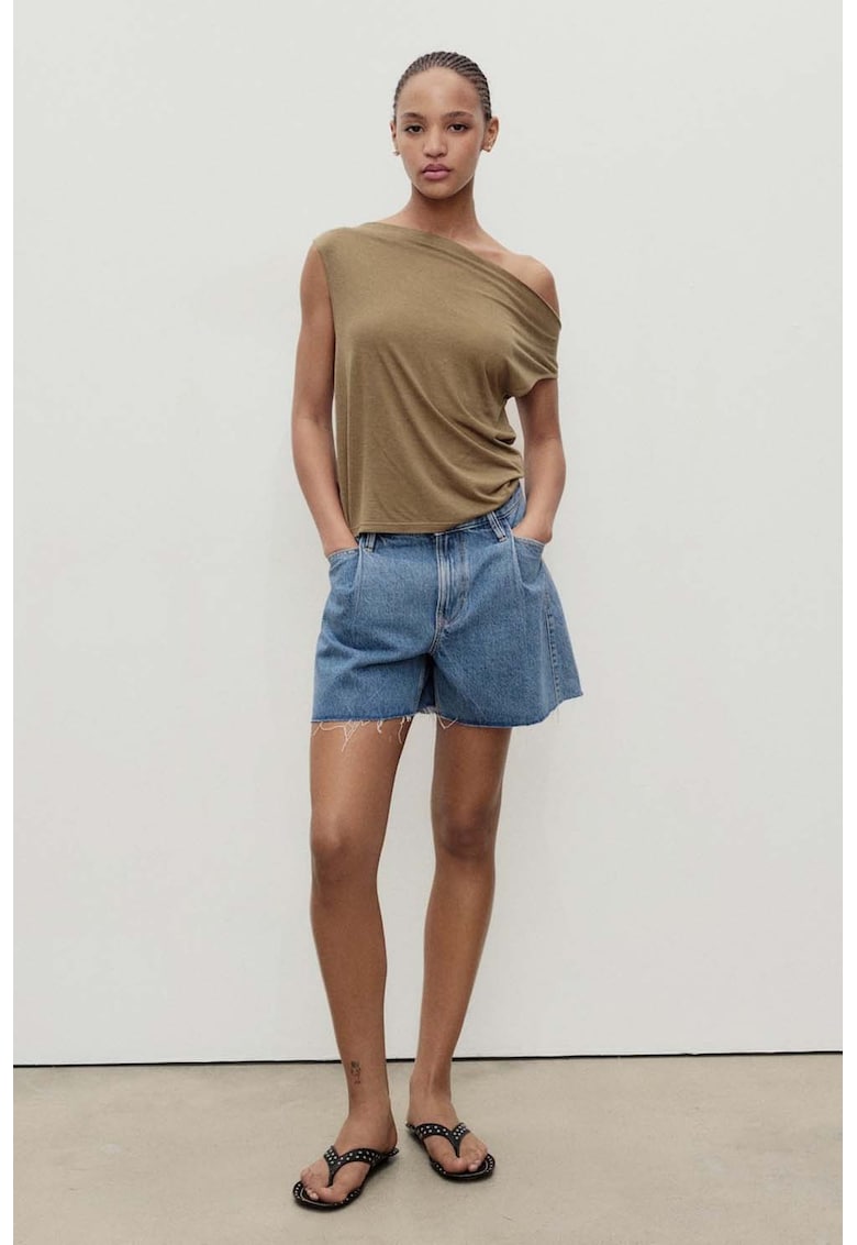 Caracteristici Culoare: albastru pastel Imprimeu: uni Croiala: croiala ampla Material: denim Talie: inalta Lungime: scurti Buzunare: 4 Detalii: terminatii nefinisate Compozitie Exterior: 100% bumbac Material garnituri: captuseala: 70% poliester