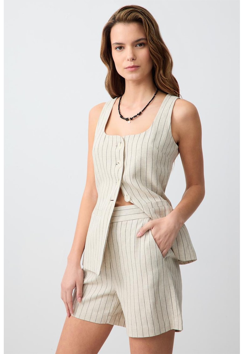 - in Imprimeu: dungi Croiala: regular fit Lungime: scurti Talie: inalta Buzunare: frontale