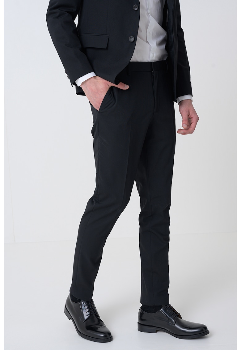 Caracteristici Culoare: negru Imprimeu: uni Material: bumbac Stil: casual Croiala: slim fit Talie: medie Buzunare: 2 oblice Lungime: lungi Sistem inchidere: fermoar Compozitie Exterior: 50% lana