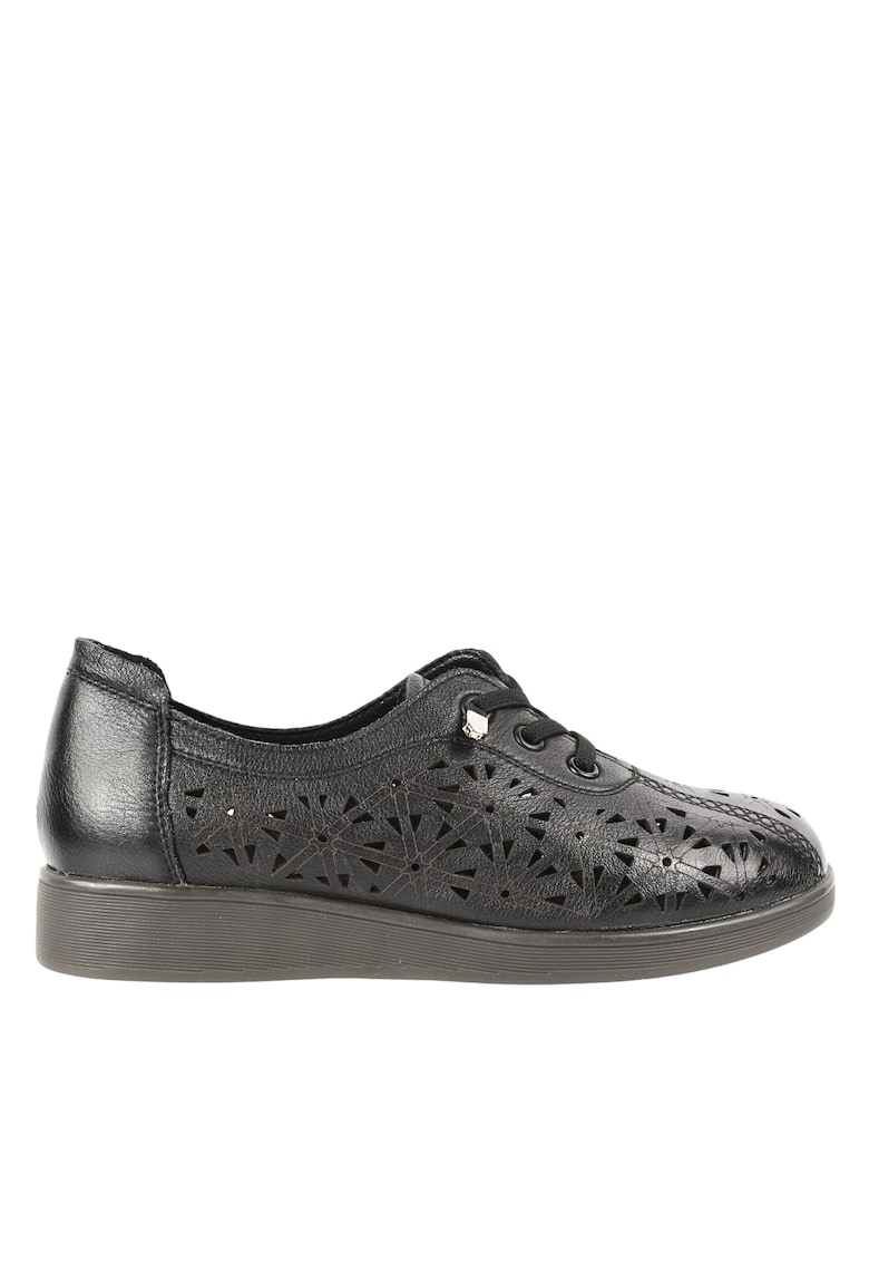 Caracteristici Material: piele naturala Culoare: negru Varf: rotund Tip talpa: plata Sistem inchidere: siret Compozitie Partea superioara: piele naturala Material interior: piele naturala Material talpa: eva Dimensiuni Platforma fata: 2 cm Platforma spate: 3 cm