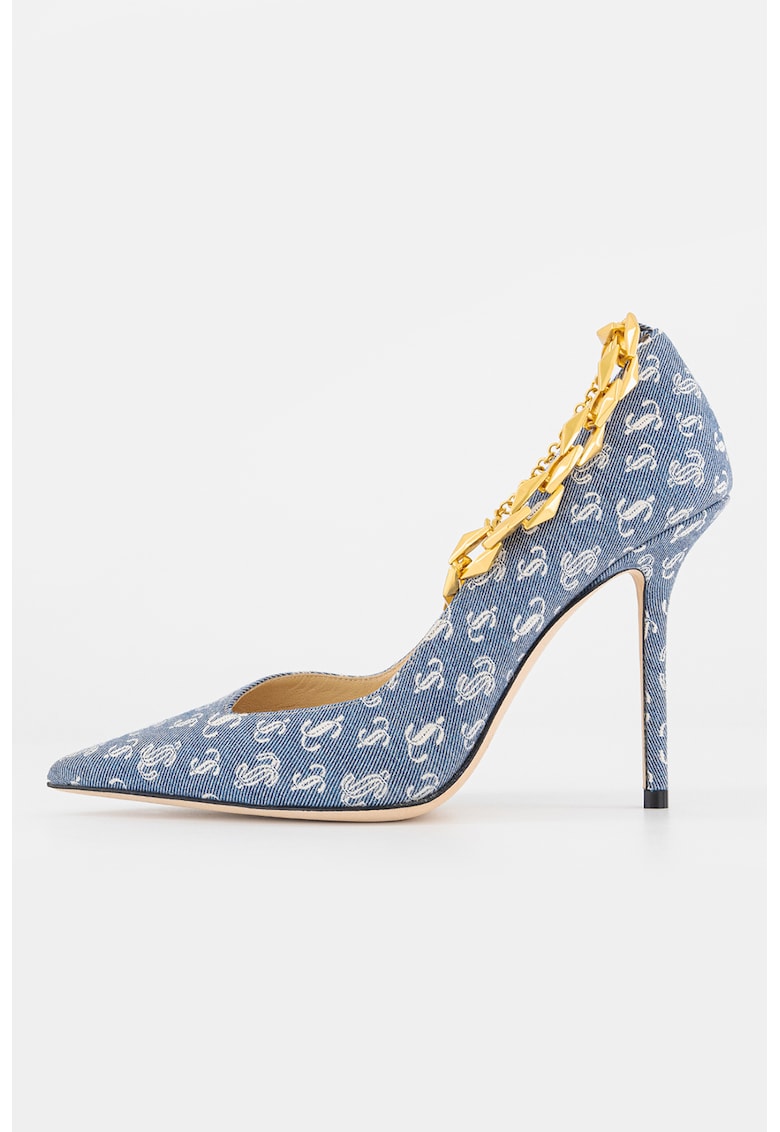 Caracteristici Tip: cu toc Material: denim Culoare: albastru lavanda Imprimeu: logo Stil: elegant Varf: ascutit Tip toc: stiletto Detalii: logo brodat