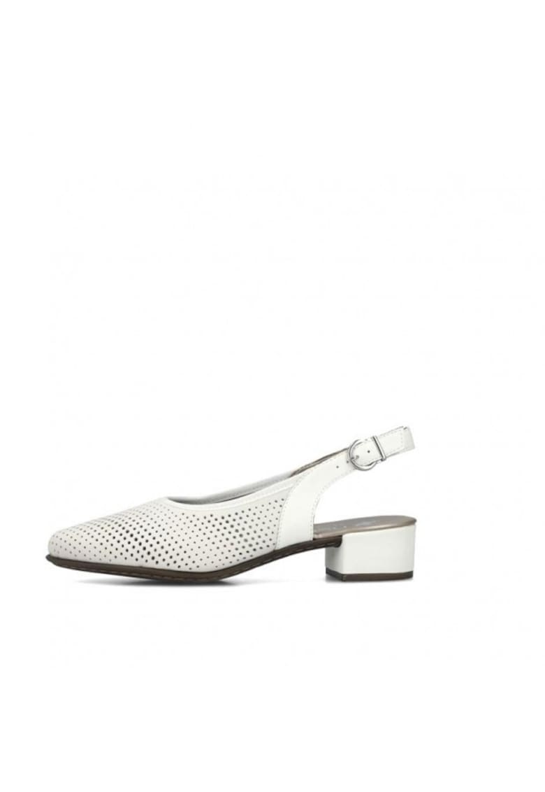 Caracteristici Tip: cu toc Material: piele naturala Culoare: alb Imprimeu: uni Stil: casual Tip toc: clasic Tip talpa: plata Detalii: aspect perforat Informatii suplimentare: bareta la spate Sistem inchidere: catarama Compozitie Partea superioara: piele naturala Material interior: mixt Dimensiuni Inaltime toc: 4 cm Inaltime talpa: 0.5 cm
