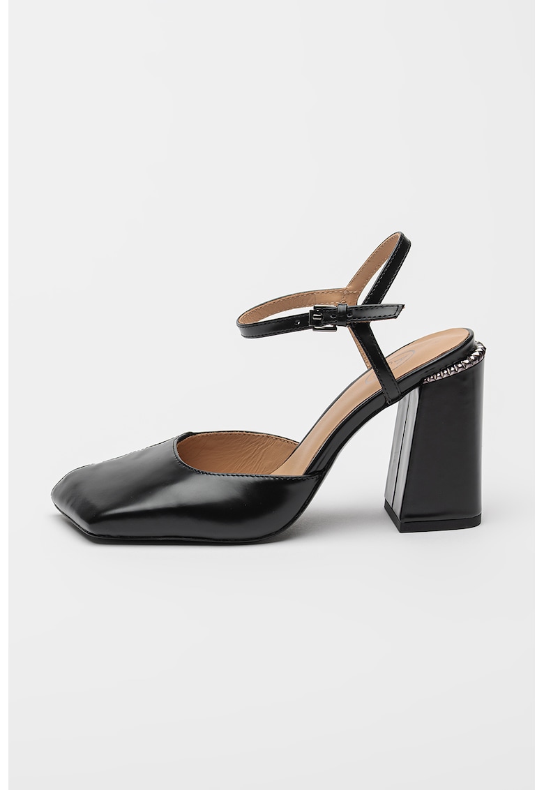 Caracteristici Tip: cu toc Material: piele naturala Culoare: negru Imprimeu: uni Stil: casual Varf: patrat Tip toc: masiv Sistem inchidere: catarama Compozitie Partea superioara: piele Material interior: piele Material talpa: alte materiale Dimensiuni Inaltime toc: 9 cm