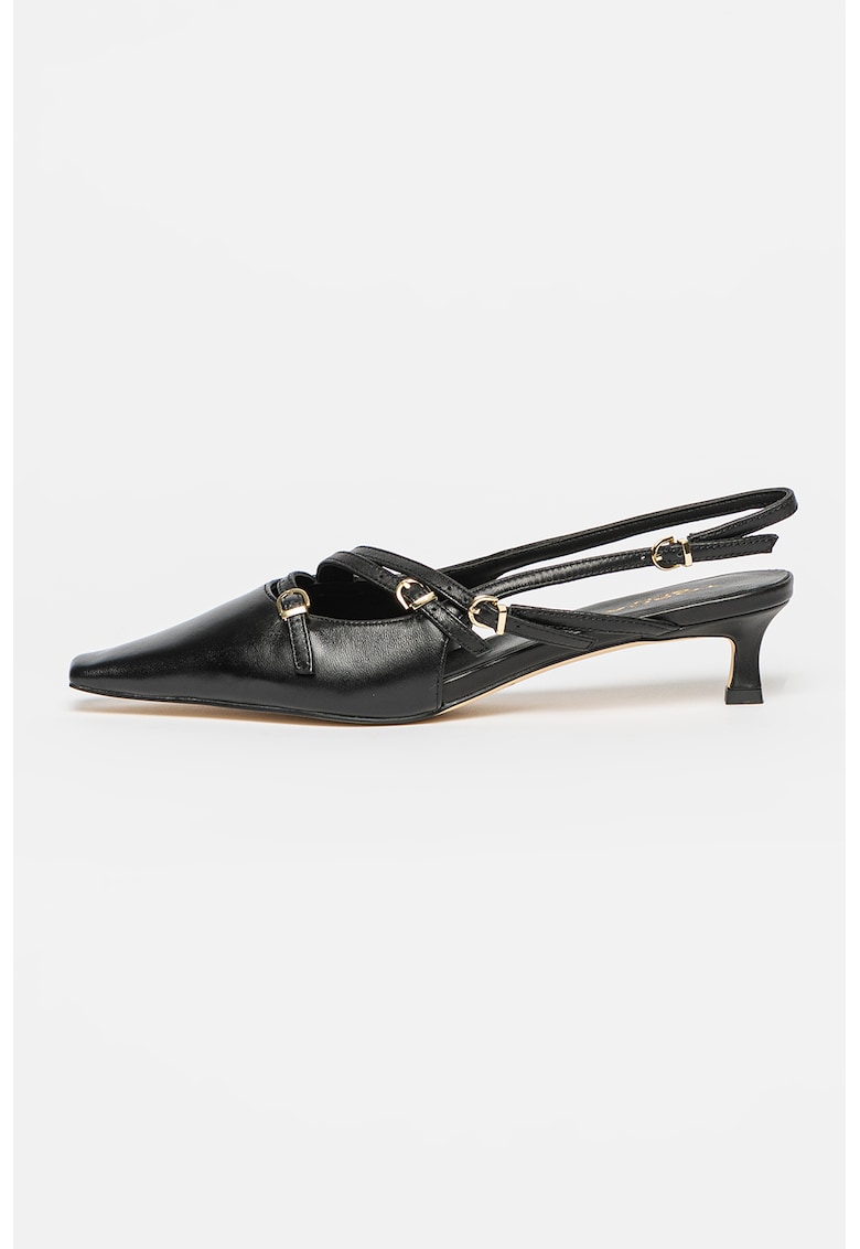 Caracteristici Tip: cu toc Material: piele naturala Culoare: negru Imprimeu: uni Stil: elegant Varf: ascutit Tip toc: clasic Sistem inchidere: catarama Compozitie Partea superioara: piele Material interior: "piele & sintetic" Material talpa: alte materiale Dimensiuni Inaltime toc: 4 cm