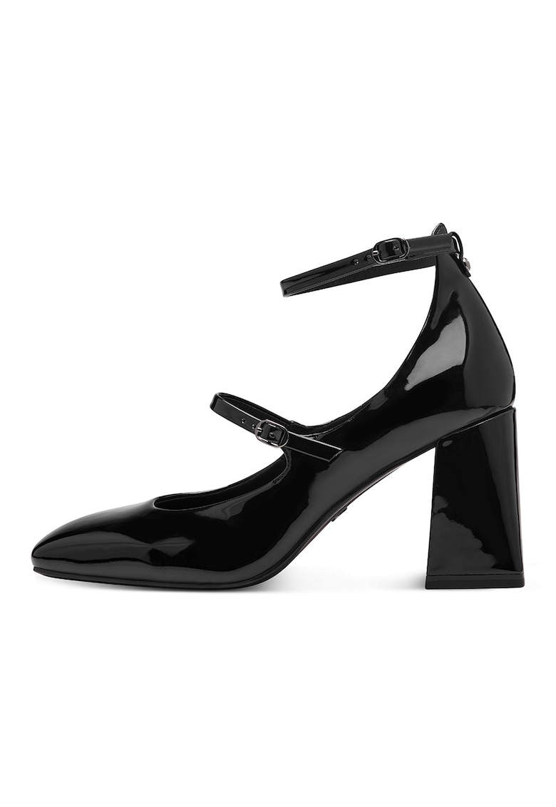 Caracteristici Tip: cu toc Material: piele ecologica Culoare: negru Imprimeu: uni Stil: elegant Varf: patrat Tip toc: masiv Detalii: aspect lacuit Sistem inchidere: catarama Compozitie Partea superioara: sintetic Material interior: sintetic Material talpa: alte materiale Dimensiuni Inaltime toc: 8.5 cm