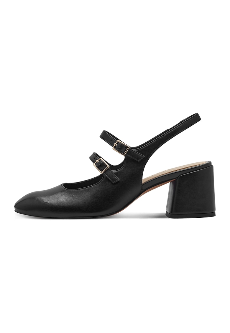 Caracteristici Tip: cu toc Material: piele ecologica Culoare: negru Imprimeu: uni Stil: elegant Varf: patrat Tip toc: masiv Sistem inchidere: catarama Compozitie Partea superioara: alte materiale Material interior: alte materiale Material talpa: alte materiale Dimensiuni Inaltime toc: 6 cm