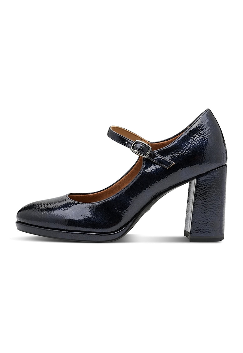 Caracteristici Tip: cu toc Material: piele ecologica Culoare: albastru ultramarin Imprimeu: uni Stil: casual Varf: rotund Tip toc: masiv Detalii: aspect lacuit Sistem inchidere: catarama Compozitie Partea superioara: material sintetic Material interior: sintetic