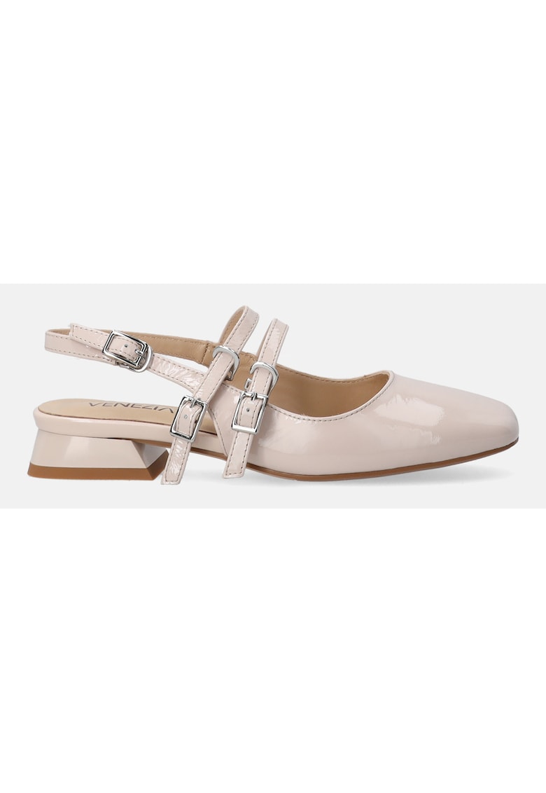 Caracteristici Tip: cu toc Culoare: bej Material: piele lacuita Imprimeu: uni Stil: elegant Varf: ascutit Tip toc: masiv Culoare elemente metalice: argintiu Compozitie Partea superioara: piele lacuita Material interior: piele Material talpa: 100% sintetic Dimensiuni Inaltime toc: 3 cm
