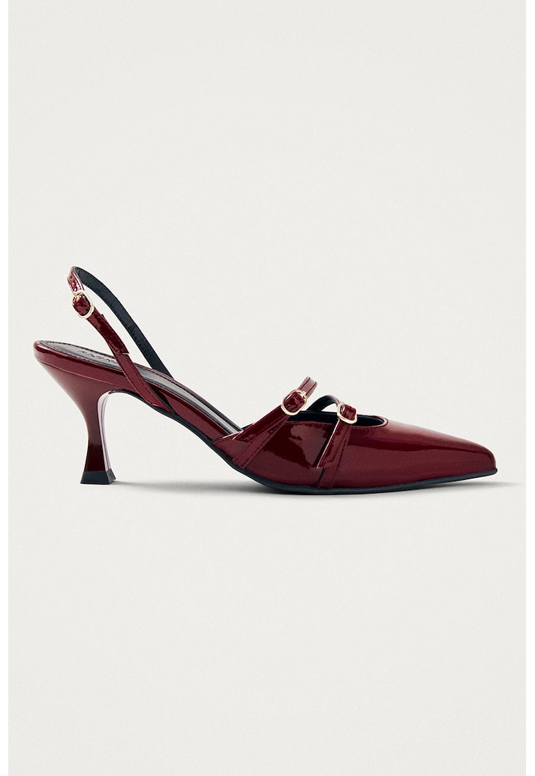 Caracteristici Tip: cu toc Material: piele lacuita Culoare: visiniu Imprimeu: uni Stil: casual Varf: ascutit Tip toc: clasic Sistem inchidere: catarama Compozitie Partea superioara: piele lacuita Material interior: piele Material talpa: alte materiale Dimensiuni Inaltime toc: 7.5 cm