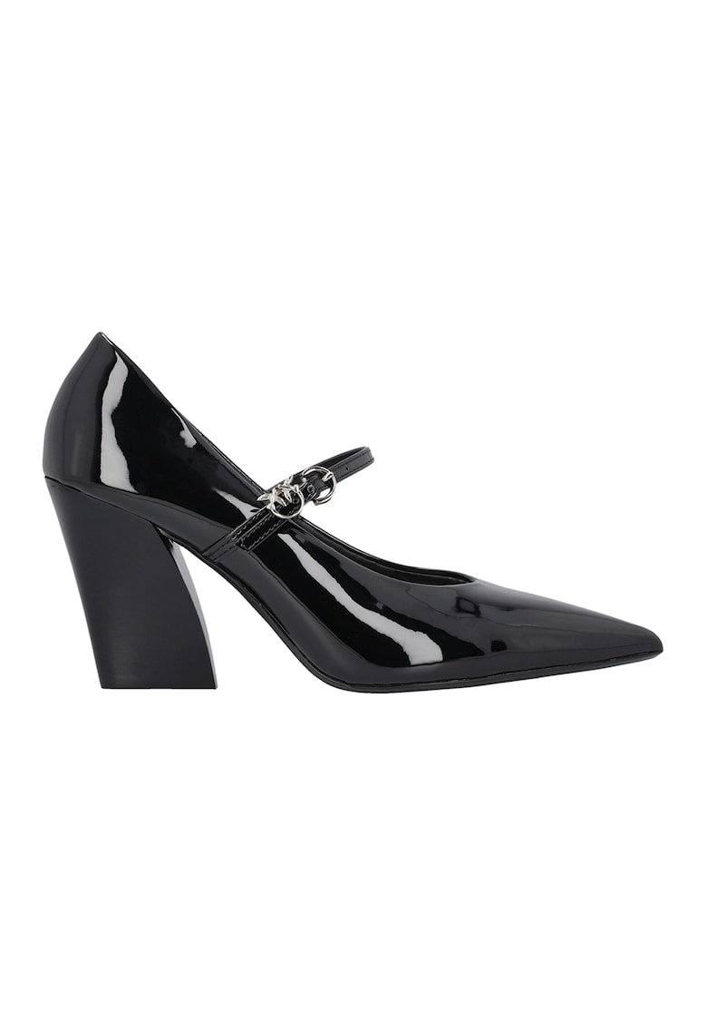 Caracteristici Tip: cu toc Material: piele ecologica Culoare: negru Imprimeu: uni Stil: elegant Varf: ascutit Tip toc: masiv Detalii: aspect lacuit Sistem inchidere: catarama Compozitie Partea superioara: piele ecologica Material interior: piele Material talpa: alte materiale Dimensiuni Inaltime toc: 8.5 cm