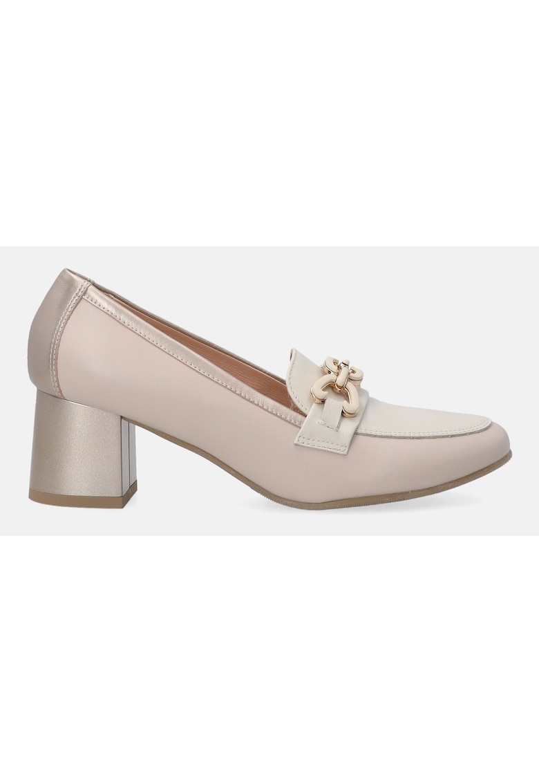 Caracteristici Tip produs: pantofi loafer Culoare: bej Material: piele naturala Imprimeu: uni Stil: elegant Varf: rotund Tip toc: masiv Sistem inchidere: fara inchidere Compozitie Partea superioara: piele Material interior: piele Material talpa: alte materiale Dimensiuni Inaltime toc: 5.5 cm