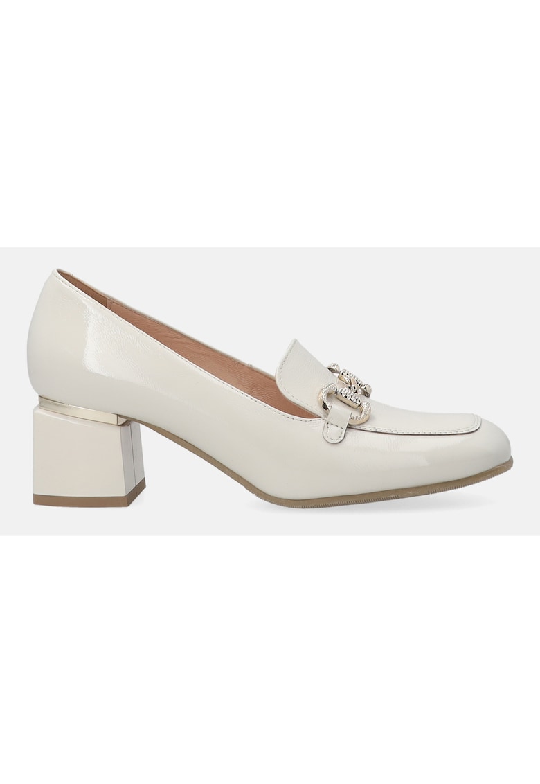 Caracteristici Tip produs: pantofi loafer Culoare: bej Material: piele lacuita Imprimeu: uni Stil: elegant Varf: patrat Tip toc: masiv Sistem inchidere: fara inchidere Compozitie Partea superioara: piele Material interior: piele Material talpa: alte materiale Dimensiuni Inaltime toc: 5 cm