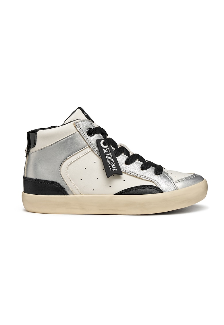 - argintiu Imprimeu: logo Stil: casual Material: piele ecologica Sistem inchidere: siret Tip talpa: plata Tehnologie: geox respira® Compozitie Partea superioara: piele ecologica Material interior: textil Material talpa: alte materiale