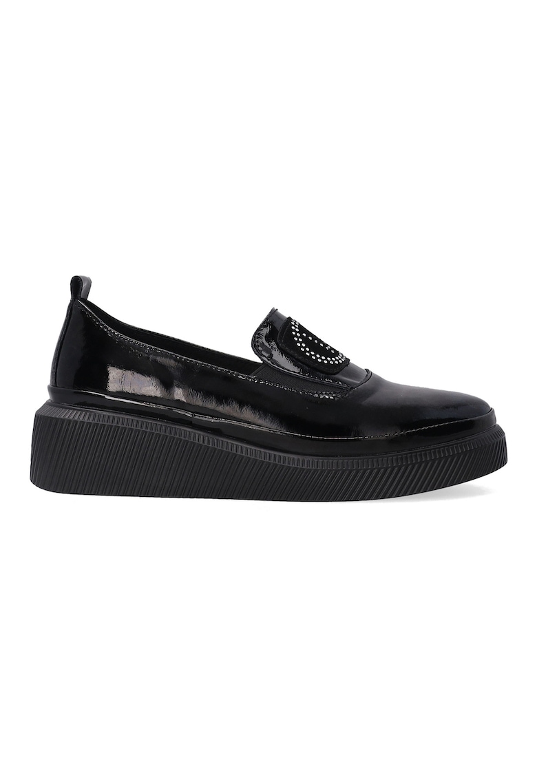 Caracteristici Tip produs: pantofi loafer Culoare: negru Material: piele lacuita Imprimeu: uni Stil: casual Varf: rotund Tip talpa: wedge Compozitie Partea superioara: piele lacuita Material interior: piele naturala Material talpa: sintetic Dimensiuni Platforma spate: 5 cm
