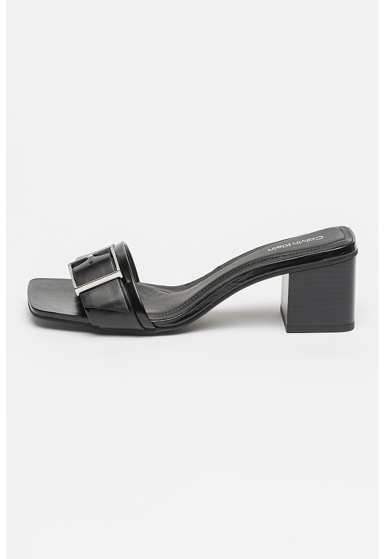 Caracteristici Tip produs: papuci Culoare: negru Material: piele naturala Stil: casual Imprimeu: uni Varf: patrat Tip toc: masiv Detalii: catarama decorativa