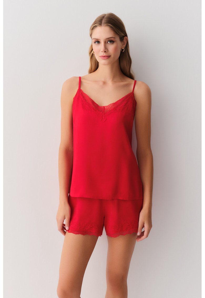 Caracteristici Tip produs: pijama Culoare: coral Material: viscoza Imprimeu: uni Decolteu: patrat Croiala: lejer Maneci: cu bretele inguste Lungime maneca: fara maneca Talie: regular Lungime pantaloni: scurti Compozitie Exterior: 100% viscoza Captuseala: 87% poliamida