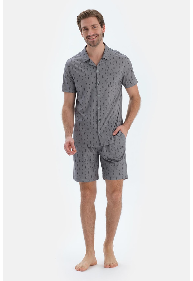Caracteristici Tip produs: pijama Continut pachet: bluza si pantaloni Culoare: gri inchis Imprimeu: diverse Material: bumbac