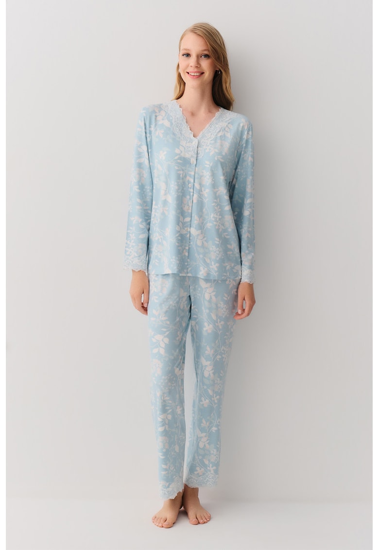 - viscoza Imprimeu: floral Decolteu: in v Croiala: slim fit Lungime maneca: maneca lunga Lungime pantaloni: lungi Sistem inchidere: nasturi Compozitie Exterior: 95% viscoza