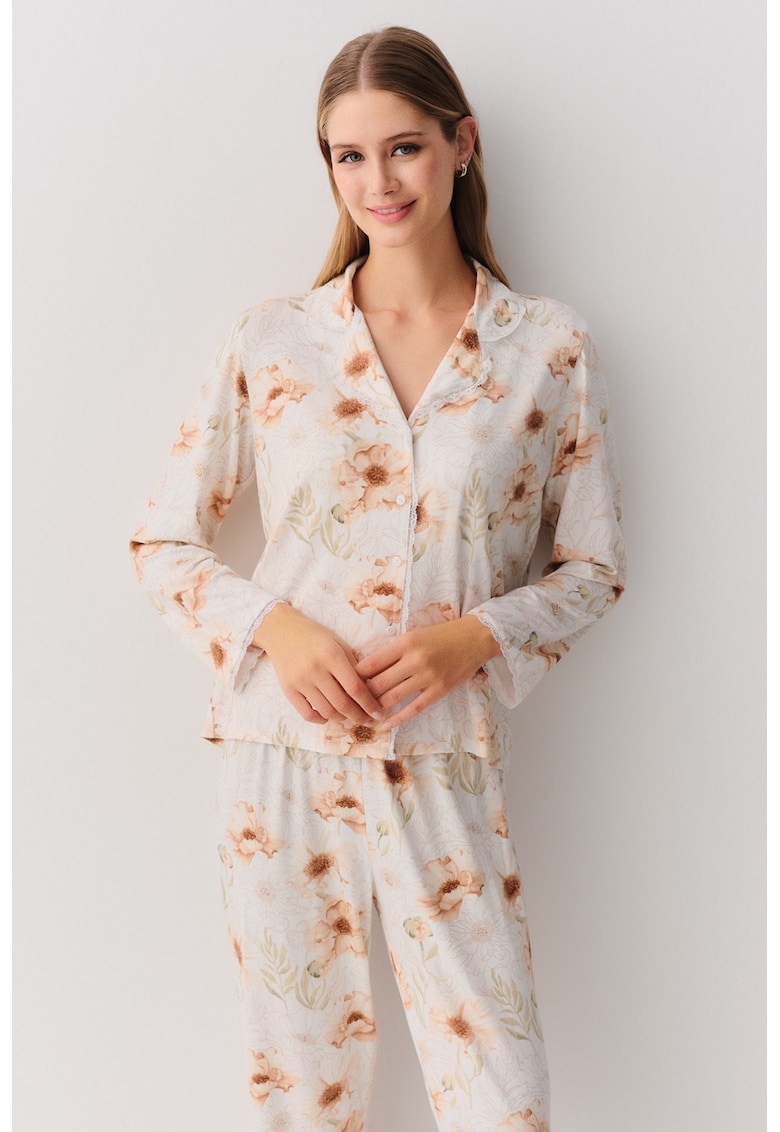 - elastan Imprimeu: floral Guler: cu revere decupate Croiala: regular fit Lungime maneca: maneca lunga Talie: medie Lungime pantaloni: lungi Sistem inchidere: nasturi Compozitie Exterior: 95% viscoza