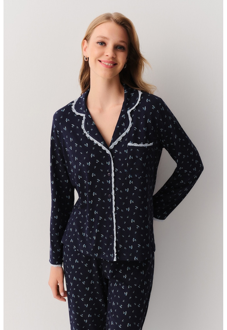 - elastan Imprimeu: floral Guler: cu revere decupate Croiala: regular fit Lungime maneca: maneca lunga Talie: m Lungime pantaloni: lungi Buzunare: unul aplicat pe piept Sistem inchidere: nasturi Compozitie Exterior: 95% viscoza