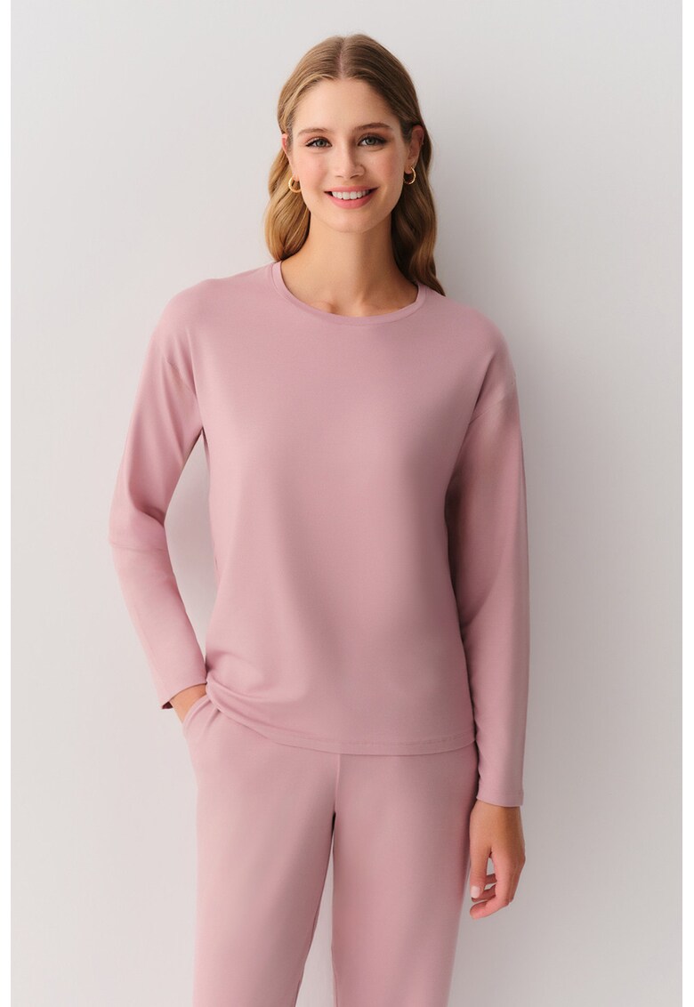 Caracteristici Tip produs: pijama Culoare: roz prafuit Material: viscoza Imprimeu: uni Decolteu: decolteu la baza gatului Croiala: regular fit Lungime maneca: maneca lunga Talie: regular Lungime pantaloni: lungi Sistem inchidere: fara inchidere Compozitie Exterior: 95% viscoza
