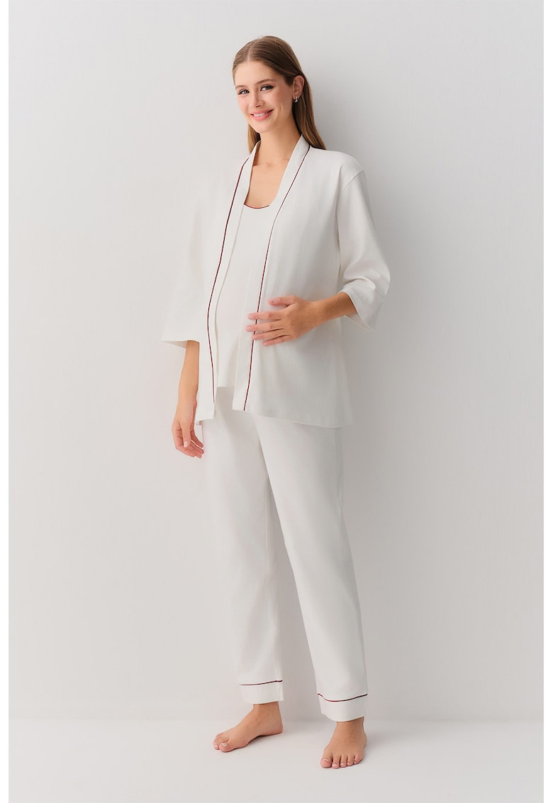 Caracteristici Tip produs: pijama Culoare: alb optic Material: bumbac Imprimeu: dungi Decolteu: in v Croiala: maternity Barete: detasabile Lungime maneca: fara maneca