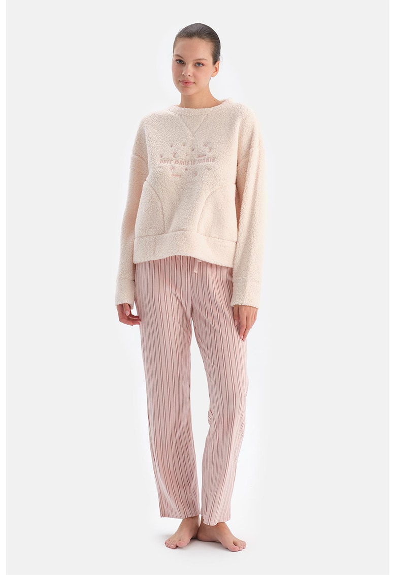 Caracteristici Tip produs: pijama Culoare: roz pastel Material: poliester Imprimeu: dungi
