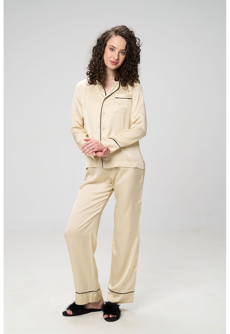 Caracteristici Tip produs: pijama Culoare: crem Material: viscoza Imprimeu: uni Decolteu: in v Croiala: regular fit Lungime maneca: maneca lunga Talie: banda elastica Lungime pantaloni: lungi Buzunare: aplicate pe piept Sistem inchidere: nasturi Compozitie Exterior: 100% viscoza lenzing™ ecovero™