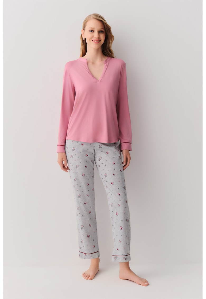 - bumbac Imprimeu: floral Decolteu: in v Croiala: regular fit Lungime maneca: maneca lunga Talie: elastica Lungime pantaloni: lungi Sistem inchidere: fara inchidere Compozitie Exterior: exterior 2: 50% bumbac