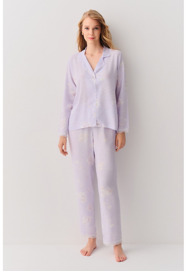 Caracteristici Tip produs: pijama Culoare: liliac prafuit Material: viscoza Imprimeu: floral Guler: cu revere Croiala: regular fit Lungime maneca: maneca lunga Lungime pantaloni: lungi Sistem inchidere: nasturi Compozitie Exterior: 100% viscoza Material garnituri: 83% poliamida