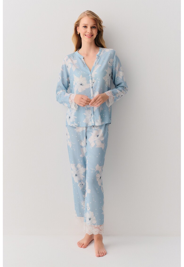 - dantela Imprimeu: floral Decolteu: decupaj in v Guler: scurt Croiala: regular fit Lungime maneca: maneca lunga Lungime pantaloni: lungi Sistem inchidere: nasturi Compozitie Exterior: 100% viscoza