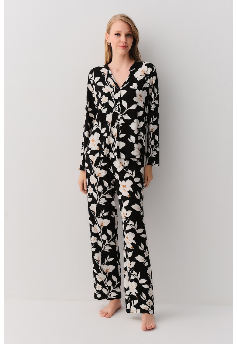 - negru stins Material: viscoza Imprimeu: floral Croiala: regular fit Lungime maneca: maneca lunga Talie: elastica Lungime pantaloni: lungi Sistem inchidere: nasturi Compozitie Exterior: 95% viscoza