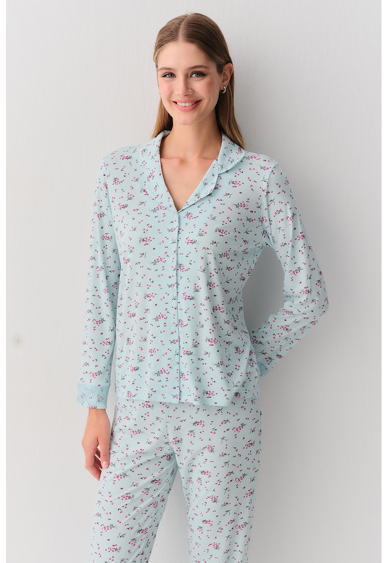 - viscoza Imprimeu: floral Decolteu: in v Lungime maneca: maneca lunga Lungime pantaloni: lungi Sistem inchidere: nasturi Compozitie Exterior: 67% viscoza