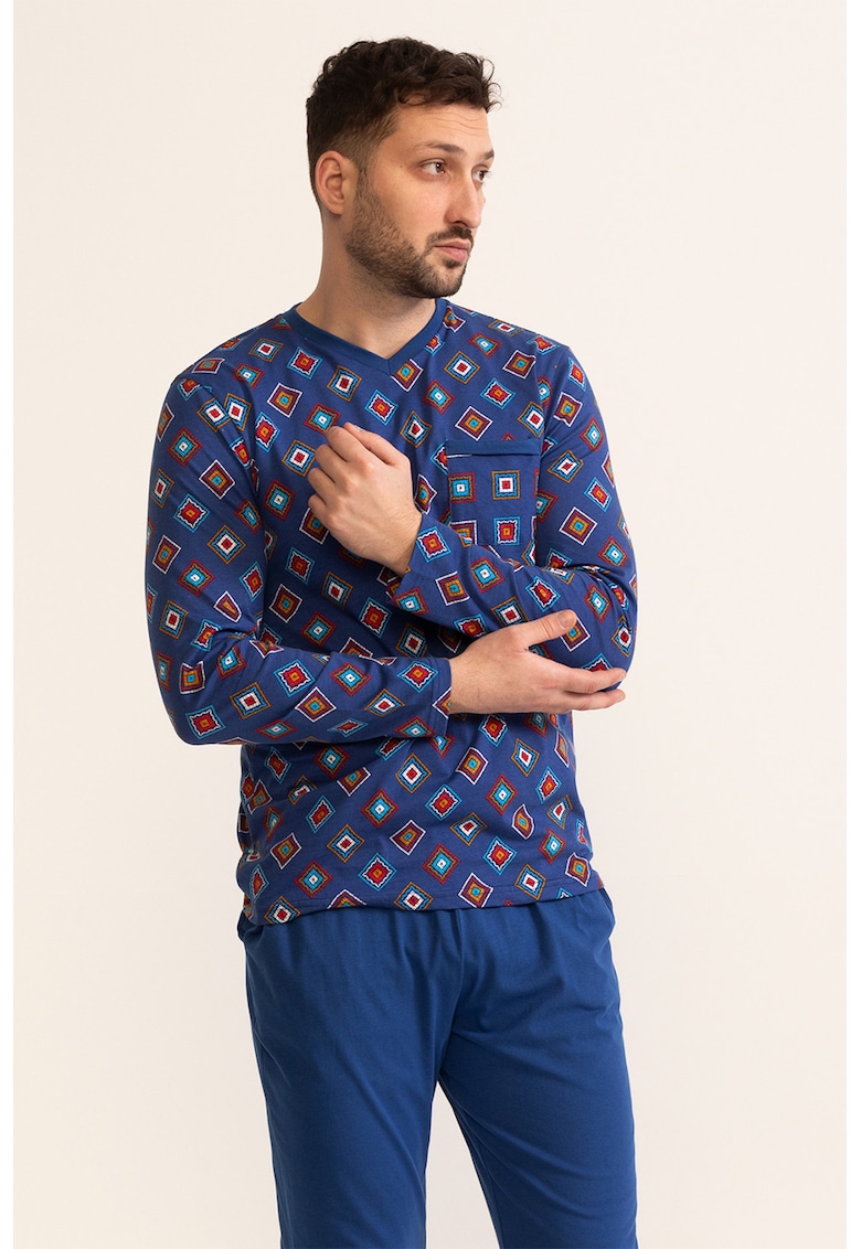 - albastru Imprimeu: geometric Material: bumbac Decolteu: la baza gatului Lungime maneca: maneca lunga Talie: medie Lungime pantaloni: lungi Sistem inchidere: fara inchidere Compozitie Exterior: 100% bumbac