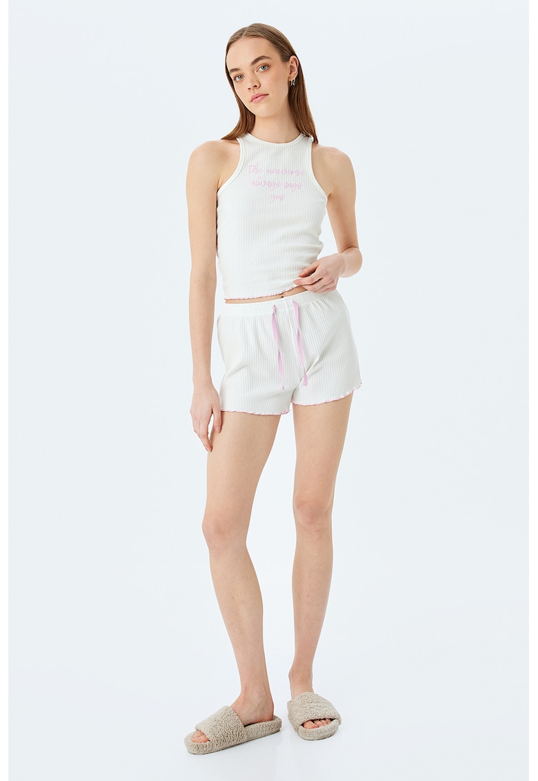 Caracteristici Tip produs: pantaloni de pijama Culoare: alb murdar Material: bumbac Imprimeu: uni Croiala: regular fit Talie: talie ajustabila cu snur Lungime pantaloni: scurti Detalii: striatii Sistem inchidere: fara inchidere Compozitie Exterior: 93% bumbac