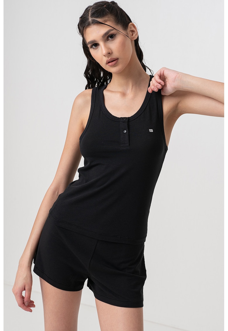 - modal Imprimeu: uni Decolteu: rotund Croiala: regular fit Lungime maneca: fara maneca Lungime pantaloni: scurti Compozitie Exterior: 57% bumbac organic