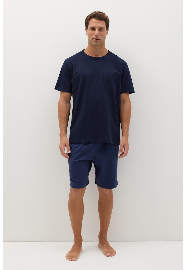 Caracteristici Tip produs: pijama Continut pachet: tricou si pantaloni scurti de pijama Culoare: bleumarin Imprimeu: uni Material: sintetic