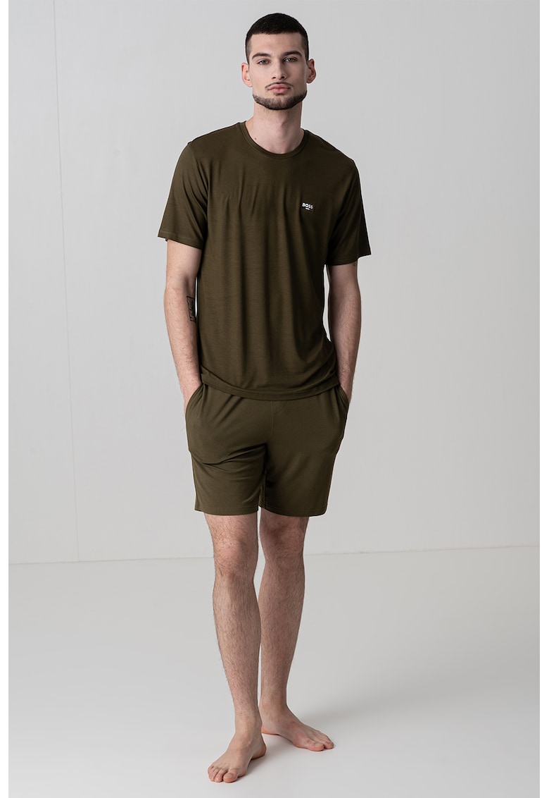 Caracteristici Tip produs: pijama Culoare: verde inchis Imprimeu: logo Material: viscoza Decolteu: la baza gatului Lungime maneca: maneca scurta Talie: cu banda elastica si logo Lungime pantaloni: scurti Compozitie Exterior: 94% viscoza